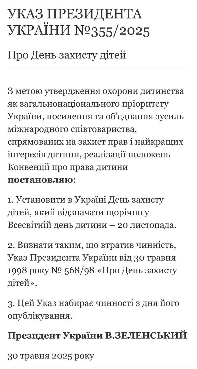 Президент Владимир Зеленский решил изменить дату празднования Дня Защиты Детей в Украине с 1 июня на 20 ноября. Это сделано с целью отличаться от России. Однако стоит учитывать, что 1 июня – это международный день, который отмечается во всех странах. В то время как 20 ноября является Всемирным днем ребенка, который представляет собой совершенно другой праздник.