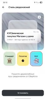Предлагаются три варианта настройки – классический, позитивный и стильный вариант с известным маскотом СберКота. В последнем случае уведомления будут отправляться с игривым «мурлыкающим» акцентом. Обновление доступно всем, кто использует последнюю версию приложения.