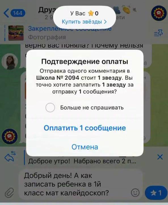В одной из столичных школ внедрили платные сообщения в родительском чате. Изначально отправка сообщения обошлась в 1 звезду, но вскоре расценки увеличили до 33 звезд. Организаторы объяснили данное решение стремлением сократить количество однотипных вопросов.
