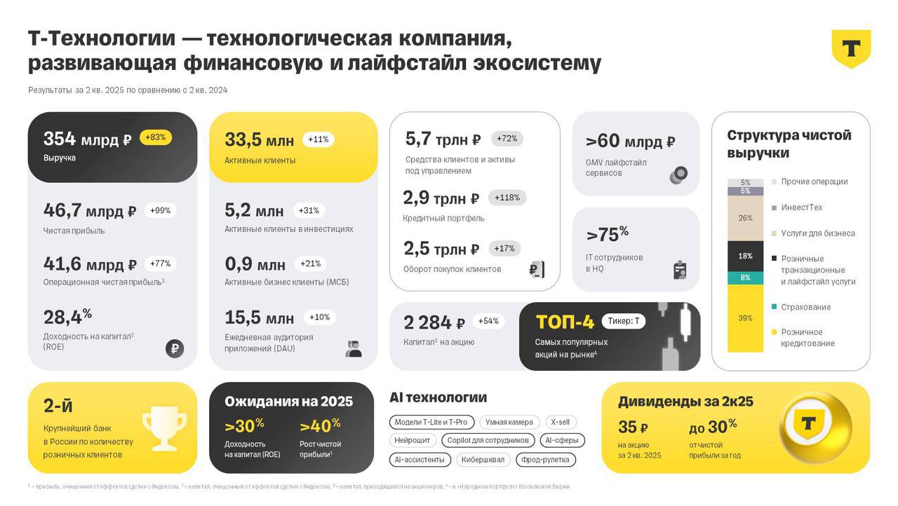В результате второго квартала 2025 года чистая прибыль составила 46,7 млрд рублей, а выручка увеличилась на 83%, достигнув 354 млрд. Общее количество клиентов экосистемы превысило 51 млн.